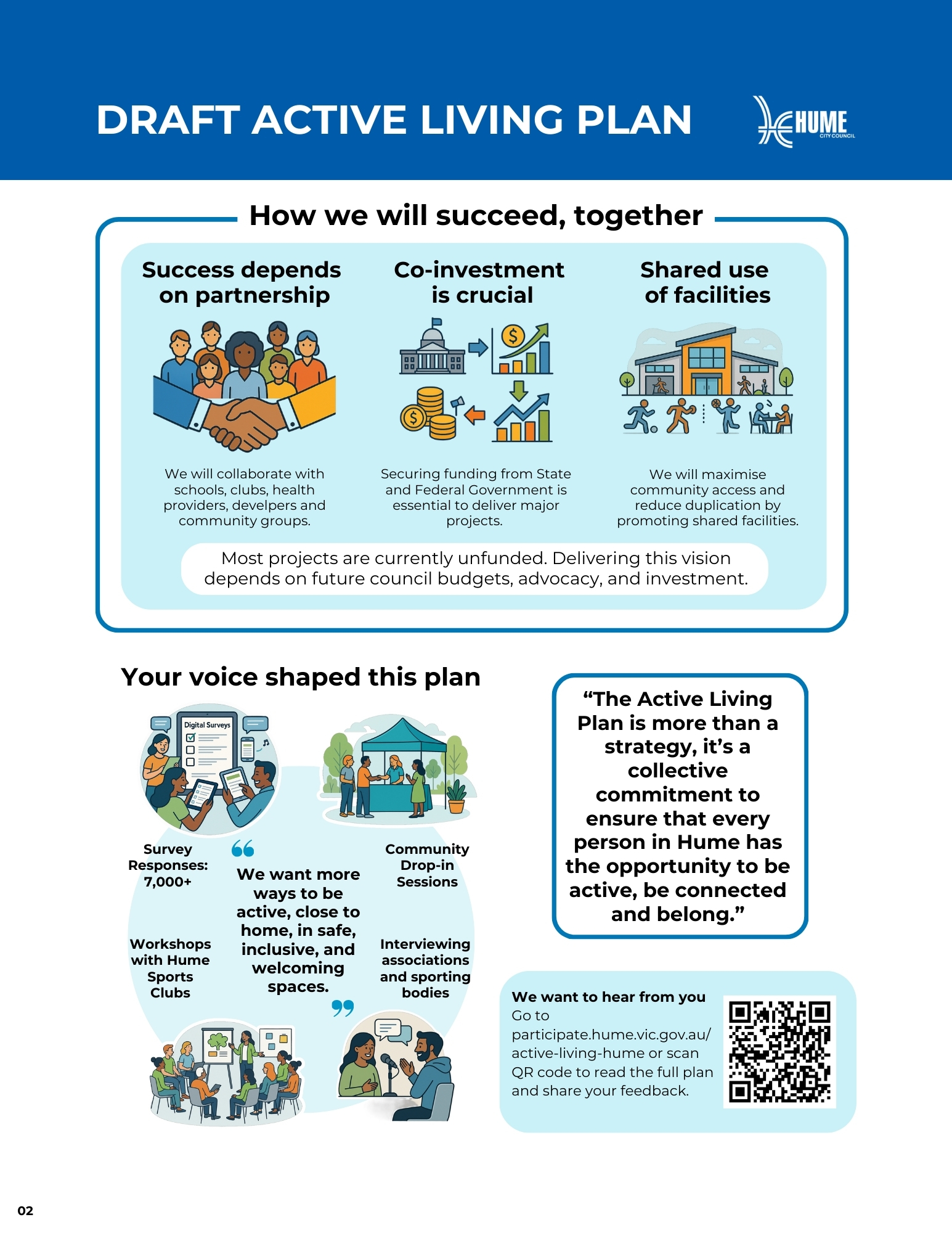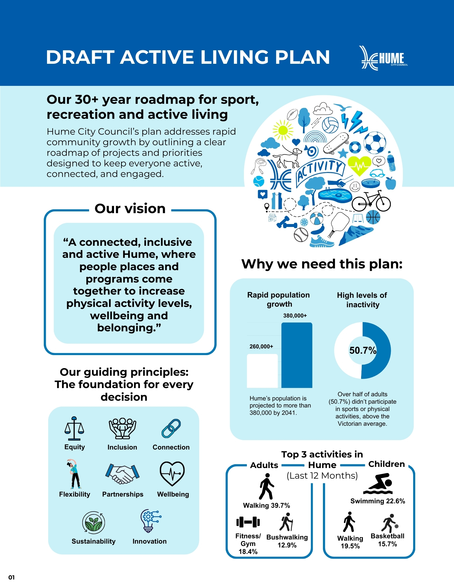 Hume City Council is developing an Active Living Plan to enhance the health and well-being of the Hume community through the promotion of physical activity and active lifestyles. It will guide how Council plans and spends money on sports, parks, recreation, and leisure activities and opportunities into the future.